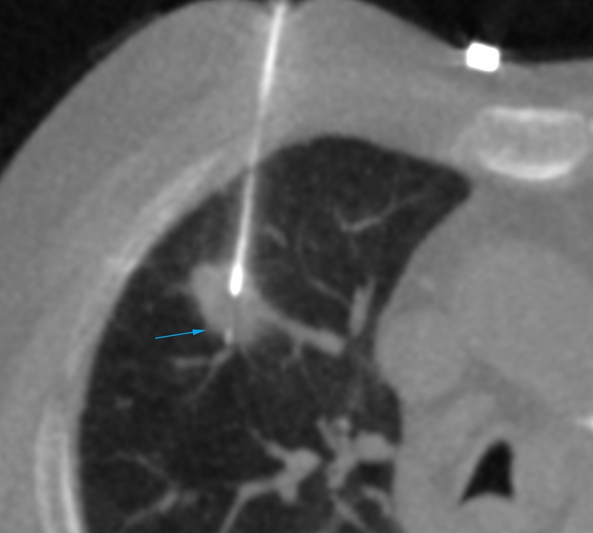 A 67-years old ex-smoker came for a CT-guided biopsy. The biopsy was uneventful.