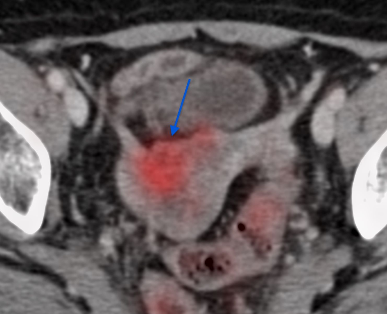 This 68-years old had carcinoma cervix for which she treated. There was recurrence in the uterine cavity, but the lesion could not be targeted easily for a biopsy due to a high-grade lower uterine stenosis and both, USG guided transvaginal and hysteroscopy guided biopsy were deemed not possible and the patient was referred for a CT guided biopsy.