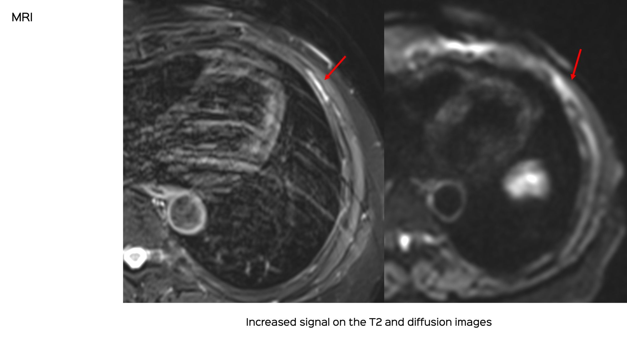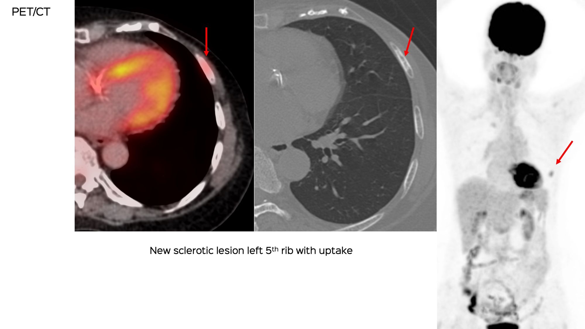 A 70-years old treated in the past for carcinoma breast was found to have a new, sclerotic left 5th rib lesion on PET, confirmed on MRI. She was refused a biopsy because of the risk of lung injury.