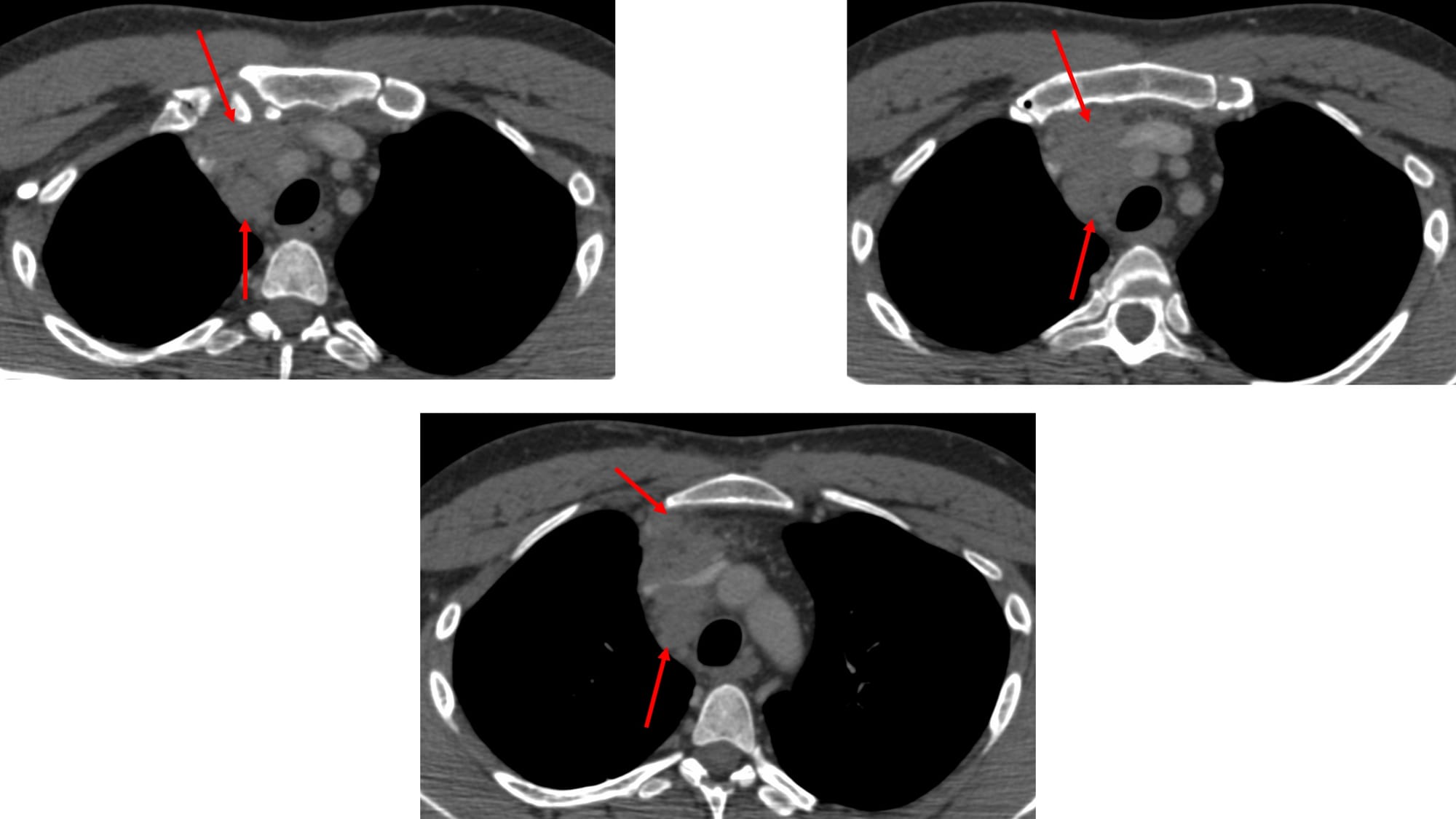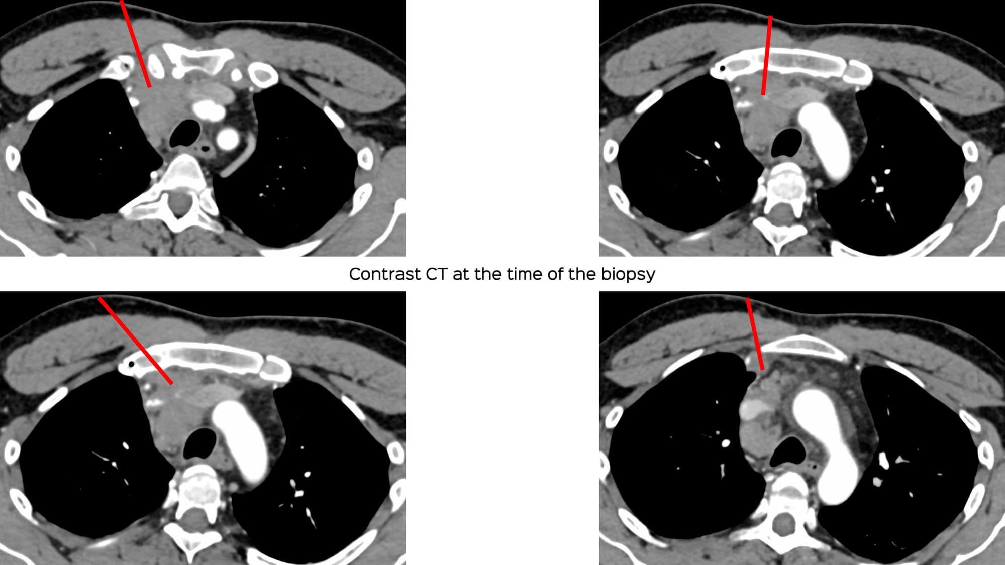 A 46-years old presented with a prevascular space nodal mass extending into the middle mediastinum.