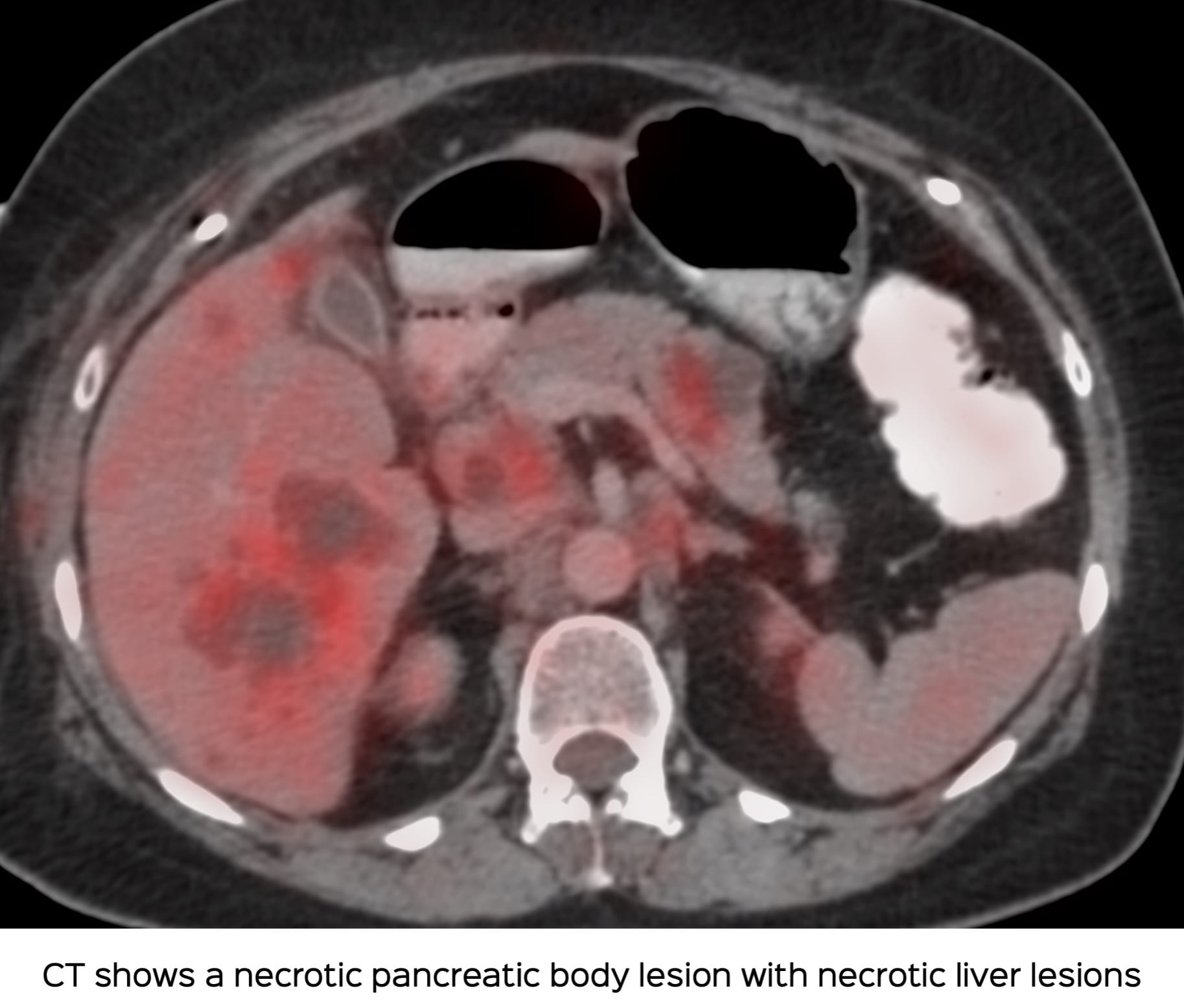 A 55-yrs old presented with a pancreatic body mass and liver lesions.