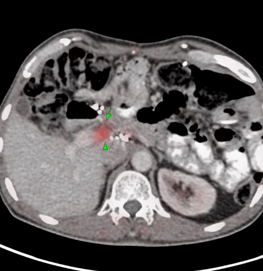 61-years old treated for Ca stomach with a Whipple’s had a new active node on a FAPI PET/CT.