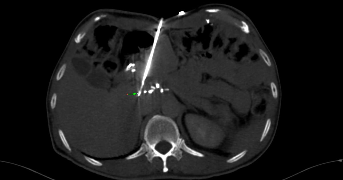 Sometimes a difficult lesion needs a combination of techniques as in this patient with a small periportal node following Whipple’s where the blunt-tip technique was used with a fixed-point method and intraprocedural intravenous contrast.